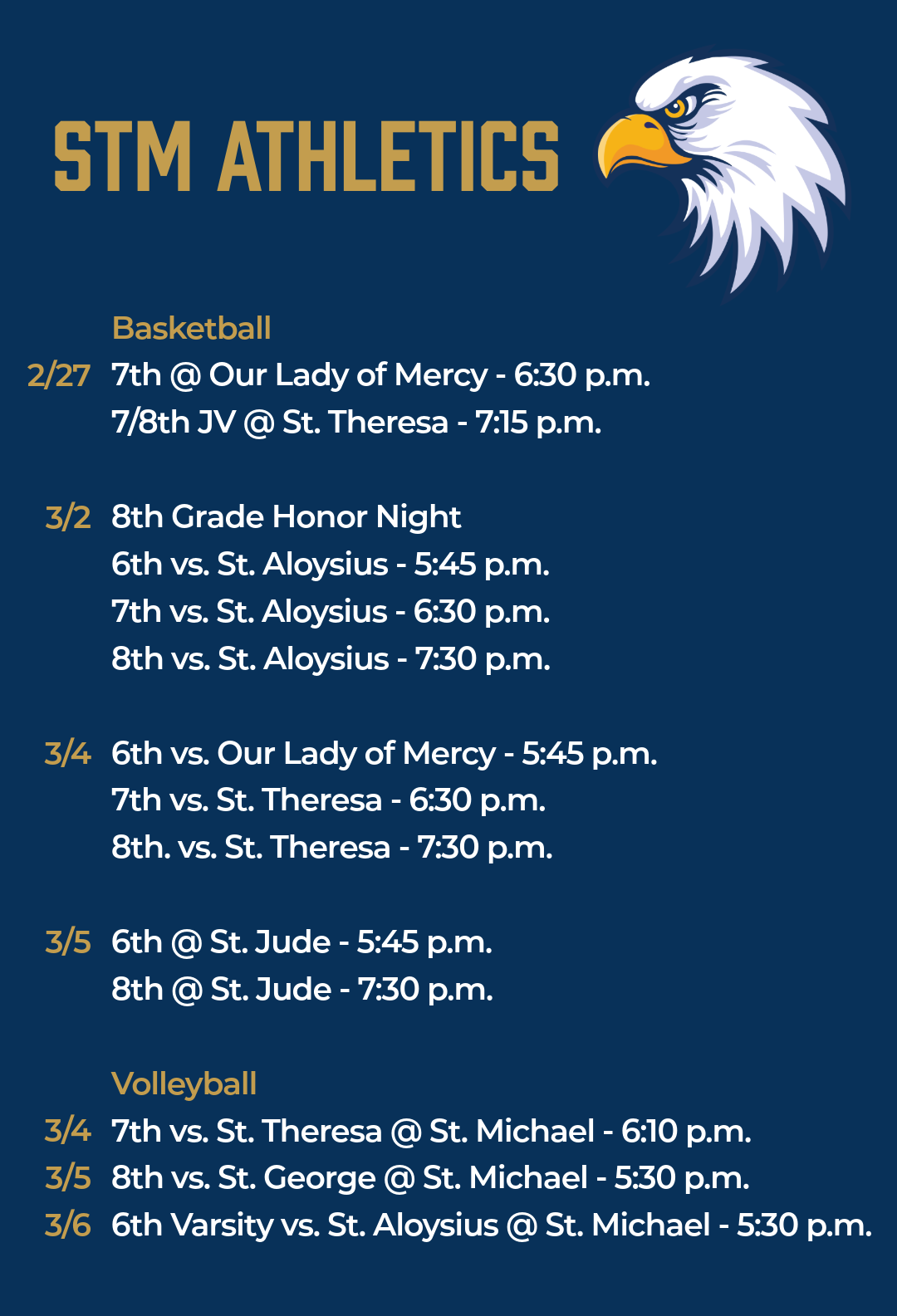 STM Church 25th annual Lenten Fish Fries are on February 27, March 13, and March 27, with dine-in and drive-thru service. Volunteers are needed - adults and students in need of service hours - for the food line, drink table, dessert table, drive thru and general support! Click here to sign up: FISH FRY VOLUNTEER